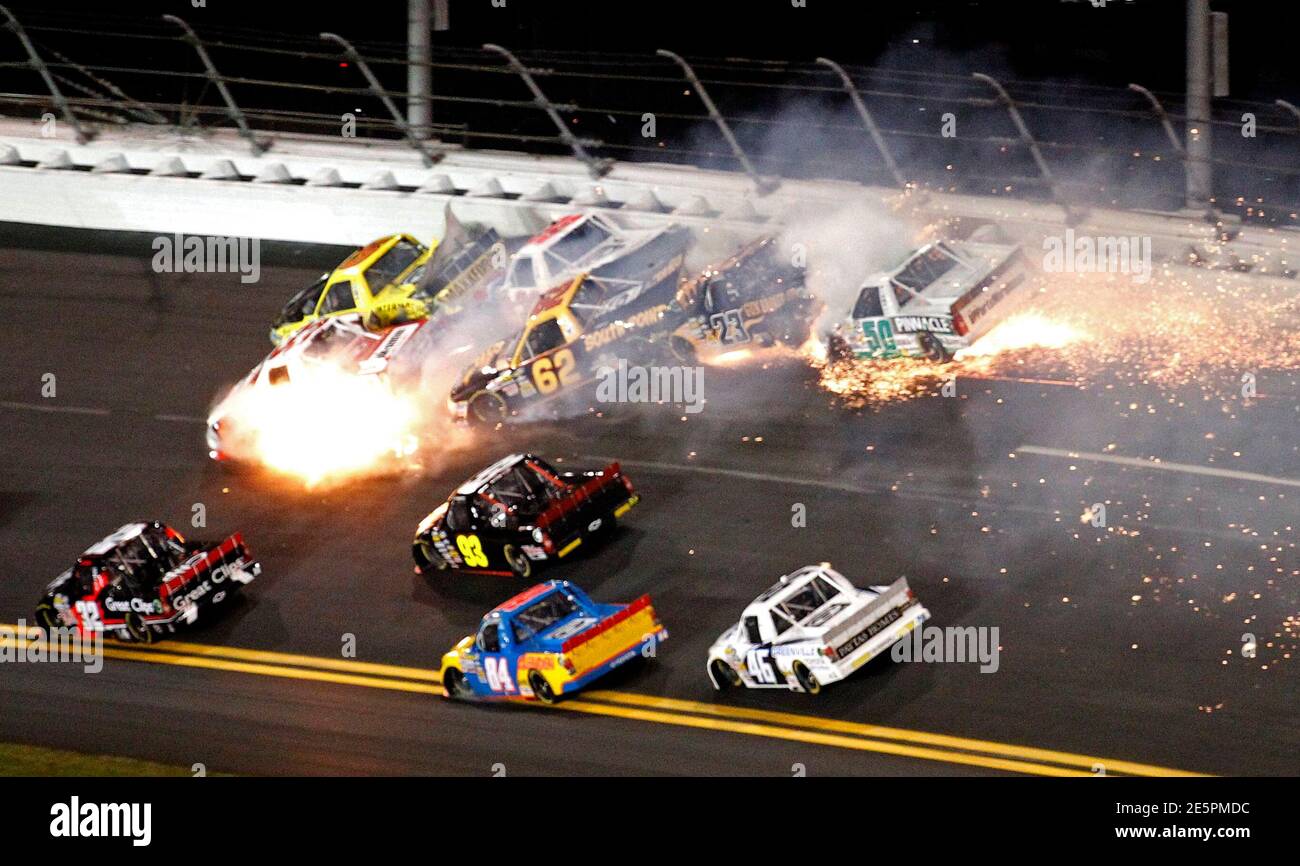 Fire Erupts From The Number 33 Middle Left Driven By Ron Hornaday Jr During A Multi Car Crash Involving A Dozen Trucks In Turn One During The Nascar Camping World Truck Series Nextera